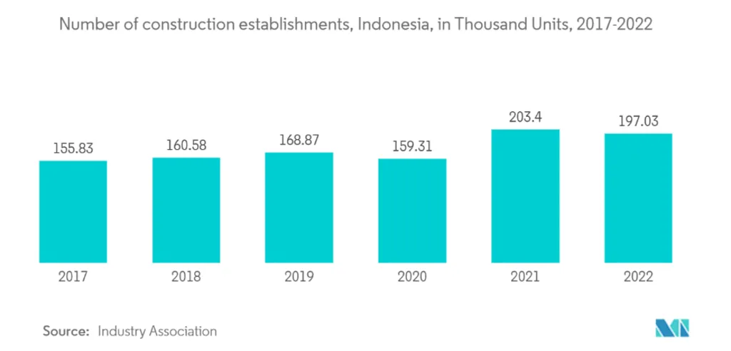 Indonesia’s government has exhibited a steadfast commitment to infrastructure development, amplifying investments to USD 429.7 billion (2020-2024), marking a 20% surge from the previous phase (2015-2019). Notably, post-COVID-19 recovery spurred robust production gains in 2021, galvanizing the nation’s infrastructural momentum. Key allocations, such as IDR 414 trillion (USD 28.5 billion) in the 2021 state budget, signify a substantial push towards upgrading vital infrastructure elements like roads, airports, and seaports—stimulating demand for construction materials and equipment.