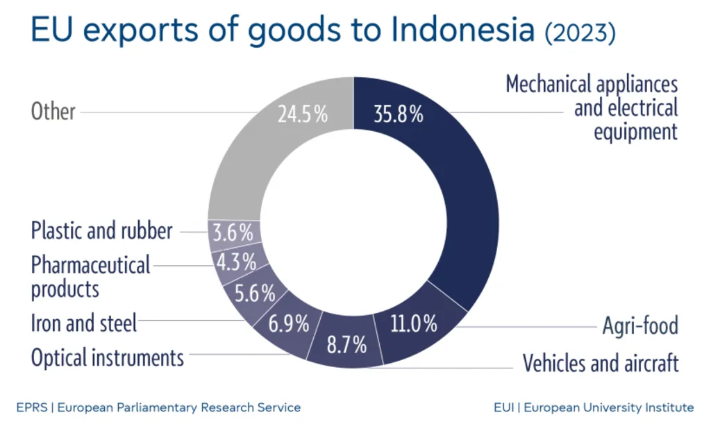 Indonesia’s top exports to the EU in 2024 included animal and vegetable oils ($2.68 billion), footwear ($1.73 billion), and electronics ($1.53 billion). On the flip side, the EU exported machinery (€3 billion), electrical equipment (€1.1 billion), and vehicles (€500 million) to Indonesia.